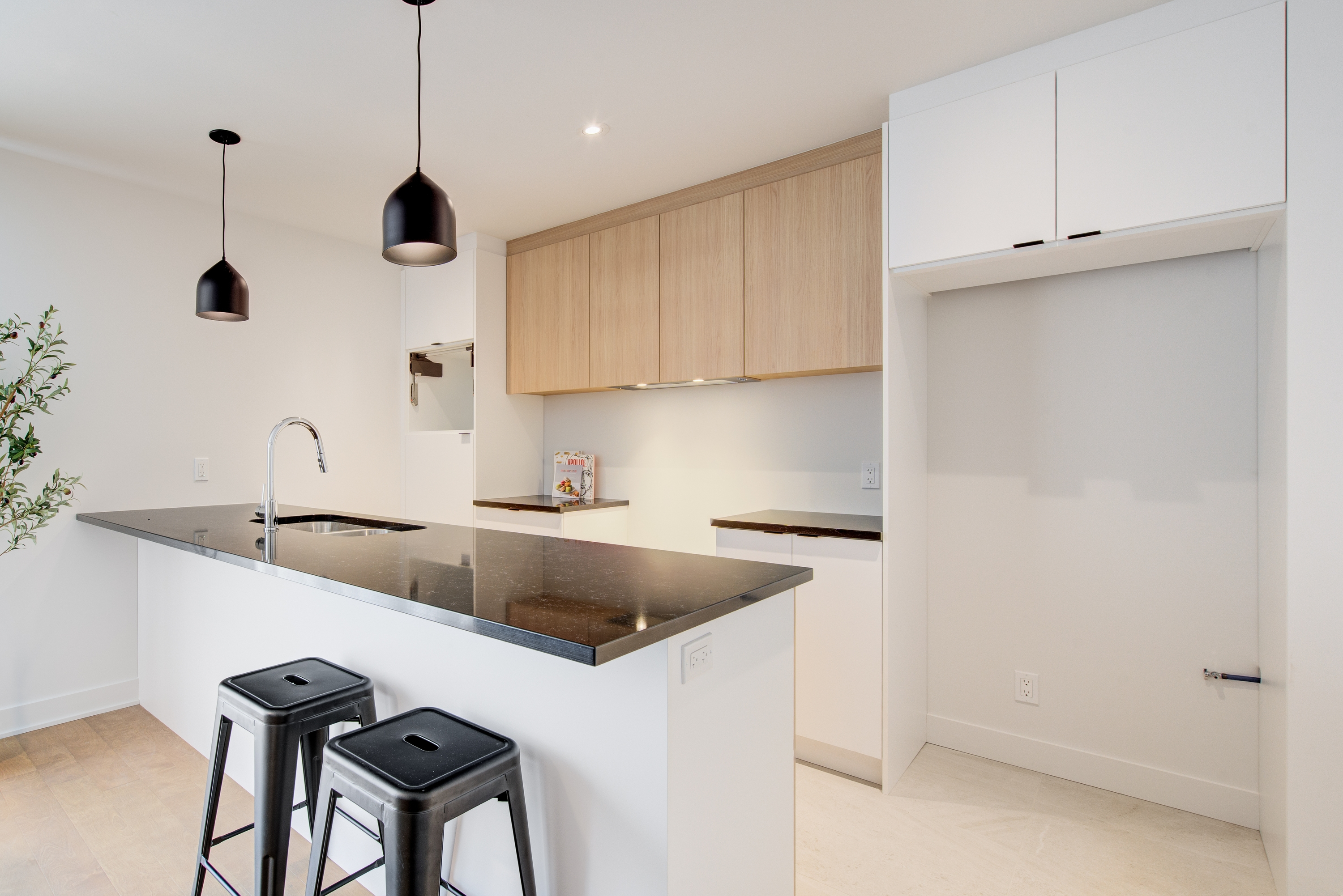 - Modern laminated kitchen cabinetry up to the ceiling, quartz countertops